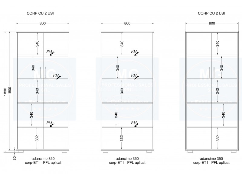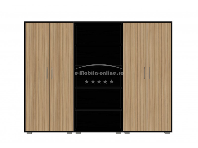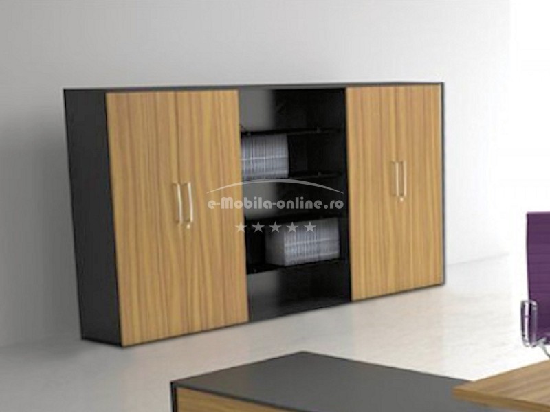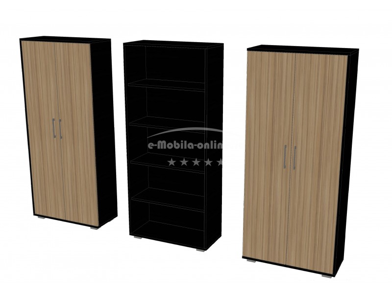 Mobilier pentru birou util pentru stocarea documentelor (dosare, bibliorafturi, etc.). Disponibil la comandă pe mai multe dimensiuni, nuanțe de material ori accesorii. Setul este compus din trei corpuri, doua cu uși și un raft fără uși, toate acestea fiind special concepute pentru stocare.